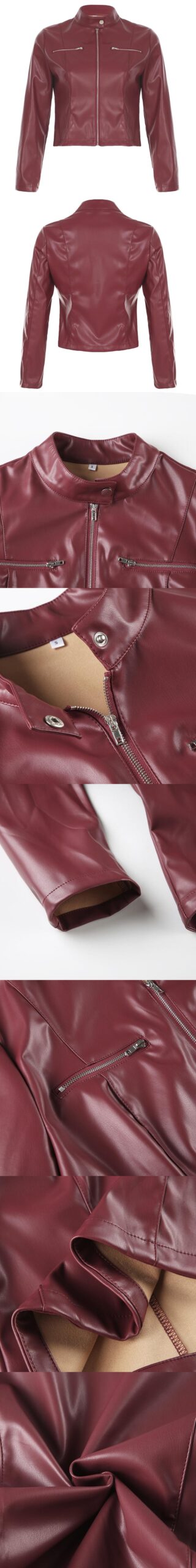 Angora red zip-up mock neck leather jacket, sleek and stylish with a luxurious feel, a versatile must-have for fall and winter occasions.