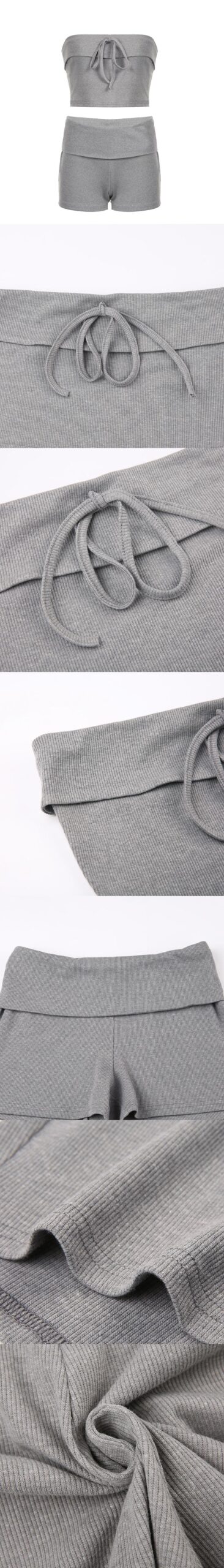 This knit ribbed bandeau set, featuring ultra-short shorts and a tank top, perfectly blends casual and sexy vibes. The bandeau design, made from delicate ribbed knit fabric, fits the body, highlighting the shoulders and chest with a simple yet feminine touch. The ultra-short shorts emphasize long legs while offering freedom of movement with their comfortable fabric. The tank top adds a cool and fresh vibe, perfect for summer or lounging indoors. Whether you’re relaxing at home or going for a casual outing or date, this set provides ultimate comfort and confidence, making it a must-have stylish piece for the summer.